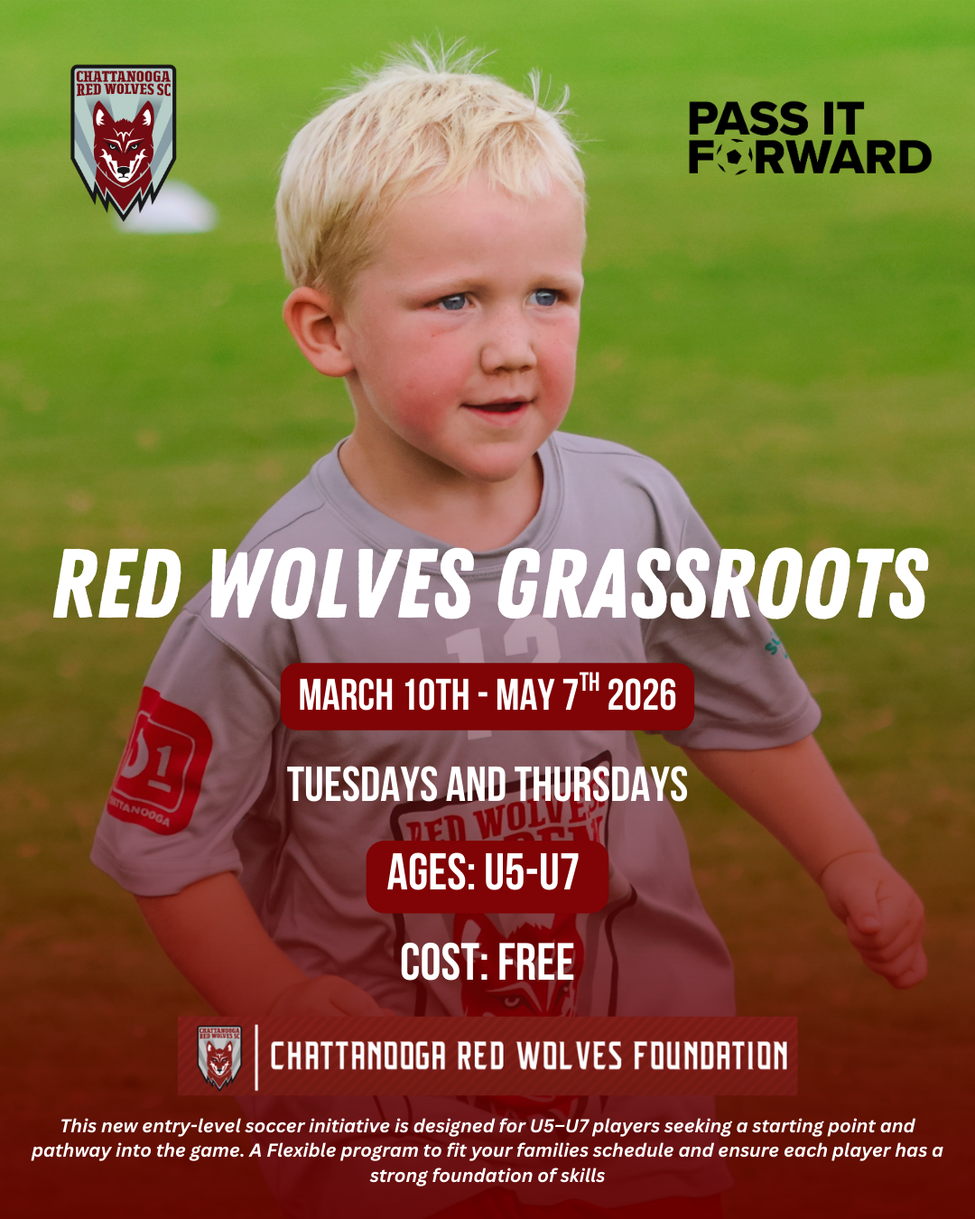 Chattanooga, TN — The Chattanooga Red Wolves Foundation today announced the launch of Red Wolves Grassroots, a free introductory soccer program open to children ages U5–U7 in the greater Chattanooga area. Supported through the Foundation's Pass It Forward initiative, the program will begin March 10 at Camp Jordan and is open to all families at no cost.